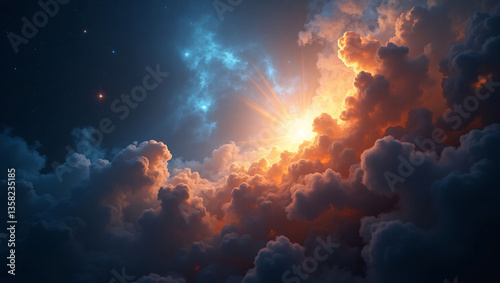 Fototapeta premium Celestial Light Burst Illuminating Dramatic Space Clouds in Starry Sky