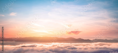 © Choat, Naklejka premium Celestial mountain landscape and dramatic sky sunrise background. Ai Yerweng, Bethong, Yala, Thailand, Asia