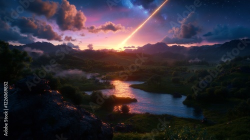 © muji, Fototapeta premium Celestial River: A Serene Sunset Landscape with a Shooting Star