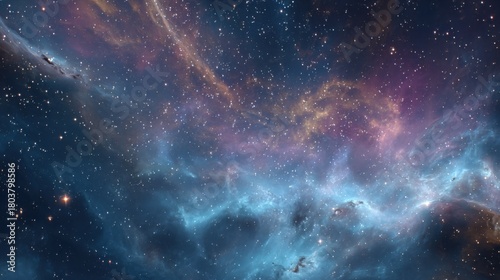 Naklejka premium Celestial scene shows vibrant colors and stars in a vast nebula against a...
