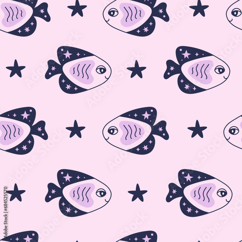 © Marina, Naklejka premium Celestial seamless pattern with fish and star. Cute childish pink endless background with cartoon underwater and sky elements in doodle style. Repeat vector illustration for kids