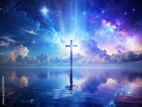 Naklejka premium Celestial Serenity: Peaceful, ethereal, blue and purple hues, cross as a...