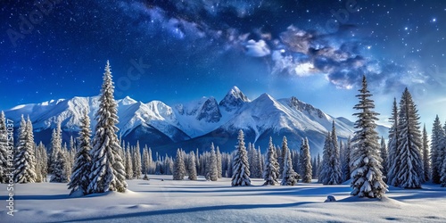 Fototapeta premium Celestial Snowscape Milky Way, Snowy Peaks, Winter Forest