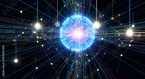 Obraz premium Celestial Sphere: A radiant sphere, illuminated by an intense burst of energy, is interwoven with luminous strings, suggesting a complex network of interconnected systems.