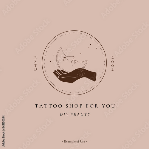© madiwaso, Naklejka premium Celestial spiritual alchemy esoteric mystical magic talisman with woman hand, moon, stars sacred geometry tattoo logo template occultism object. Vector illustration line art black outline style