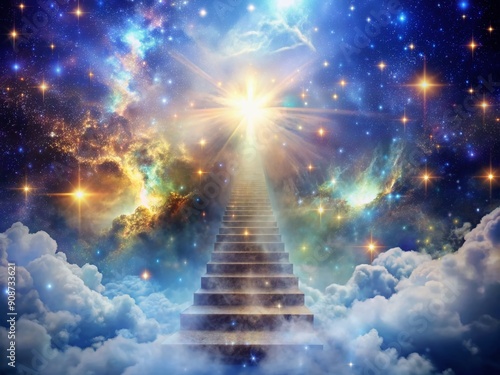 © Sirinporn, Naklejka premium Celestial staircase of shimmering stardust ascends to ethereal realms, vanishing into radiant clouds, as heavenly light beams illuminate the path to mystical dimensions.