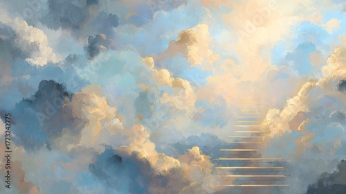Obraz premium Celestial stairway ascends through richly textured, illuminated clouds bathed...