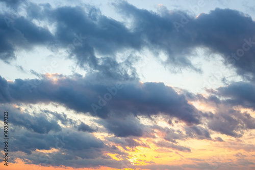Fototapeta premium Celestial sunset landscape. Dark sky with contrasting clouds and setting sun