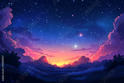 Naklejka premium Celestial Sunset. Vibrant Sky & Starry Landscape in Mystical Twilight
