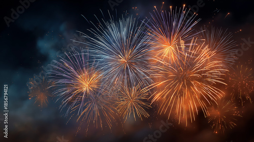 Naklejka premium Celestial Symphony: Brilliant fireworks paint the night sky with streaks of...