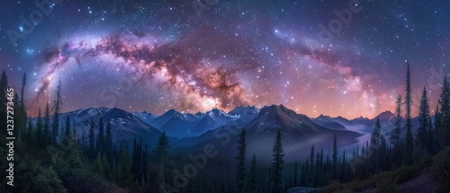 Fototapeta premium Celestial Symphony: Mesmerizing Star Trails Paint the Night Sky Over Majestic Forested Mountain Range