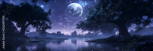 Fototapeta premium Celestial Symphony: The Luminous Midnight Tapestry of Moonlit Serenity