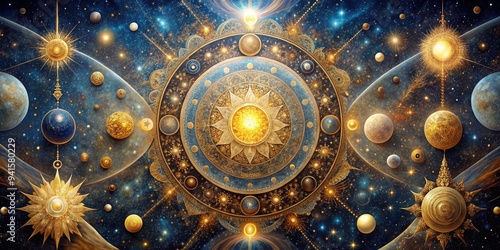 Fototapeta premium Celestial Tapestry: Interstellar golds, cosmic patterns, astral bodies,...