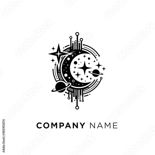 © al, Obraz premium Celestial Technology Logo with Crescent Moon and Planets.
