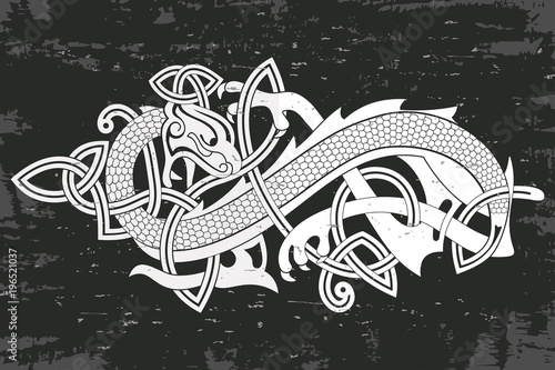 Obraz premium Celtic two-headed dragon with national ornament intertwined ribbon on a gray background with the aging effect.