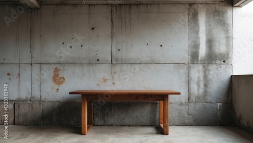 © meristock, Fototapeta premium Cement wall with grey tones featuring stain spots on the left side and a central wooden table with warm brown hues against a minimal backdrop.
