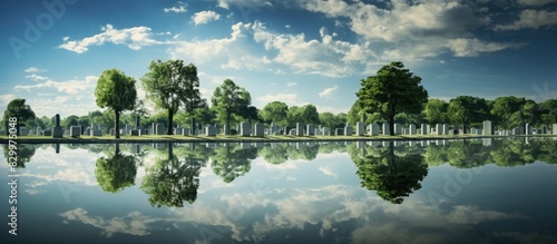 Obraz premium Cemetery monuments take form in a picturesque landscape providing a serene and tranquil space for reflection. with copy space image. Place for adding text or design