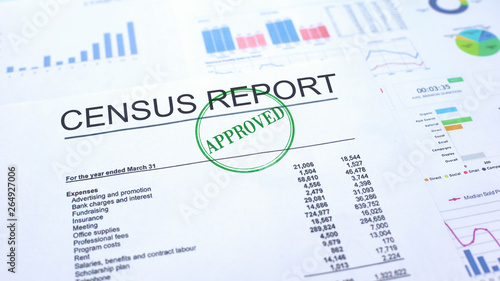© motortion, Obraz premium Census report approved, hand stamping seal on official document, statistics