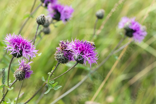 © evannovostro, Fototapeta premium Centaurea scabiosa or greater knapweed. Bright purple blossoms