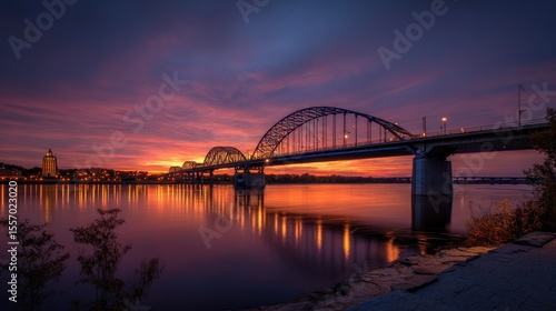 © Zarana , Naklejka premium Centennial Bridge across the Mississippi River at dusk between Rock Island, Illinois and Davenport, Iowa.