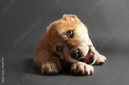 Fototapeta premium Central Asian Shepherd puppy eating bone on the floor