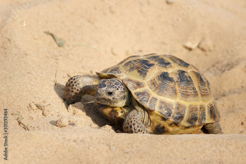 Obraz premium Central Asian tortoise crawling on the sand.
