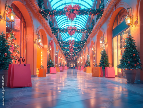 © Mister, Obraz premium Central empty 3D podium surrounded by banners featuring holiday deals and savings. The scene is filled with animated visuals of shopping bags, creating a lively, festive atmosphere.