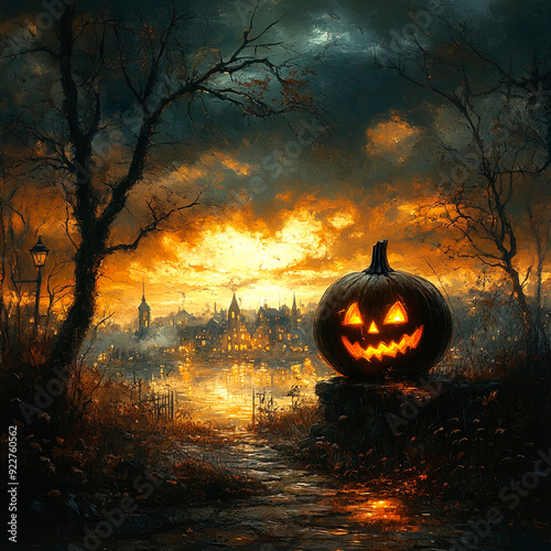 © Mister, Fototapeta premium Central empty 3D podium, with Jack-o'-lanterns and a gothic candelabra. Bats and cobwebs fill the scene, with candy strewn across a stone floor, all in a dark and mysterious atmosphere.