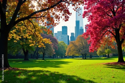 Naklejka premium Central Park's vibrant spring blooms, lush green lawns , daffodils, sky, season