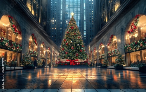 © Marina, Obraz premium Central Plaza with Christmas Tree A grand central plaza adorned with a giant Christmas tree and festive decorations, perfect for urban holiday mockups