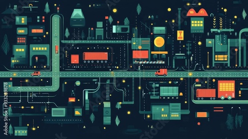 Fototapeta premium Centralized Logistics Network for Efficient Transportation and Distribution Flat Design of a Digitized Interconnected Logistics System Optimizing Cargo Flows and Supply Chain