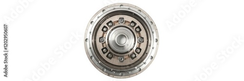 Obraz premium Centrifugal clutch with silver metallic components on white background,...