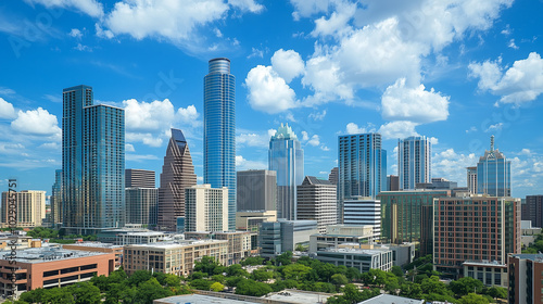 Naklejka premium Centrum miasta ukazuje szereg imponujących budynków i luksusowych wieżowców, które wznoszą się dumnie pod błękitnym niebem.