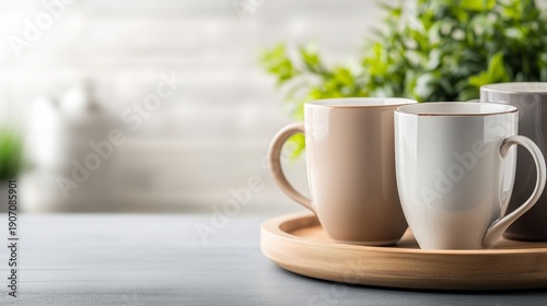 © YURY YUTY, Obraz premium Ceramic coffee mugs on wooden tray creating cozy morning breakfast scene