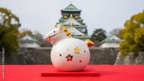 Naklejka premium Ceramic horse figurine with osaka castle in the background on a red surface