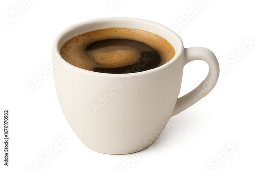 © PNG Kingdom , Fototapeta premium Ceramic white coffee mug filled with rich, dark espresso, golden crema topping, resting on pristine transparent surface
