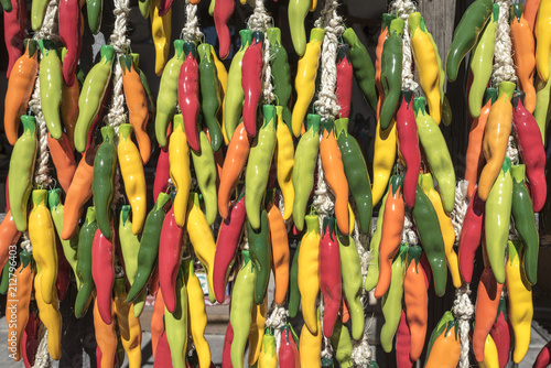 © LRafael, Fototapeta premium Ceramiczne papryczki chili. Wykonane z kolorowych papryczek chili z Santa Fe, Nowy Meksyk, USA