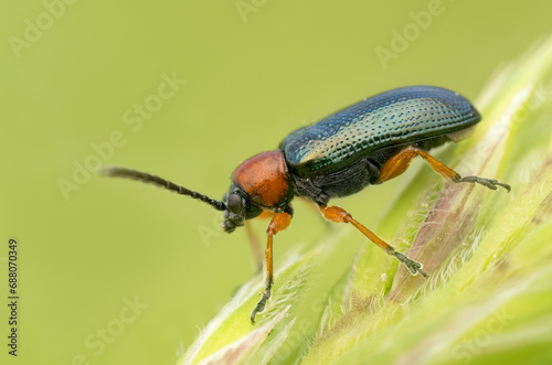 © Nathalie, Naklejka premium Cereal leaf beetle (Oulema melanopus/duftschmidi). Beautiful beetle. Colorful beetle. Beetle in natural habitat. Belgium