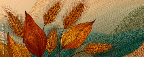© Daniel, Naklejka premium Cereal rye bread background. Leaves and ears of wheat wrapper. Agriculture straw. Orange contour line vector. Horizontal banner.