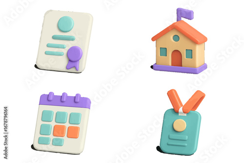 Obraz premium Certificate, School, Calendar, and Badge Icons. Modern 3D Icon Set