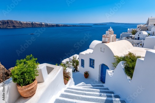 © Thanyarat, Fototapeta premium Cerulean-tiled rooftop in Santorini, with whitewashed buildings and the deep blue Aegean Sea in the background