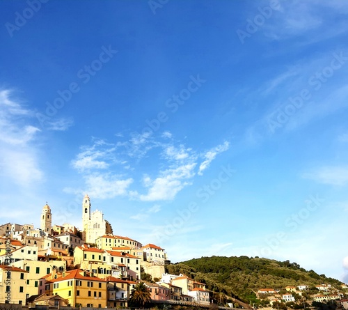 © yohananegusse, Obraz premium Cervo Ligure, Italy - 02/15/2020: Travelling around the Riviera Ligure in winter days. Beautiful photography of the small vilagges near the sea with typical old buildings.