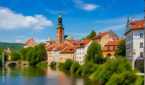 © Hanna Ohnivenko, Naklejka premium Cesky Krumlov (Czech Krumlov), Czech Republic. Antique town on river Vltava. Picturesque landscape with cosy colourful houses on banks among green trees. Sunny summer day with blue sky and clouds.