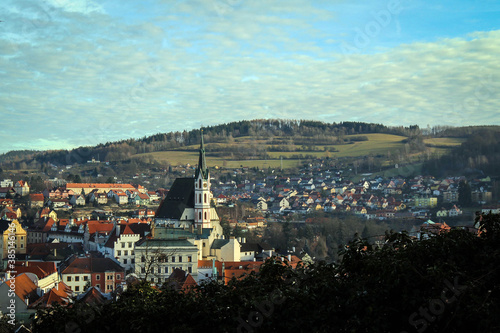 Fototapeta premium Cesky Krumlov panoramic view by winter morning, Czech Republic