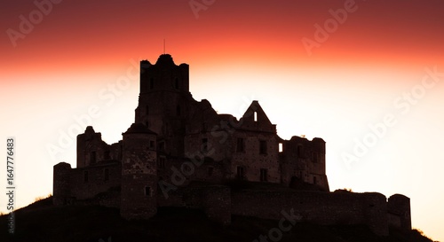 © Martin, Obraz premium Ch�teau m�di�val silhouette rouge coucher soleil dramatique. AI Generated