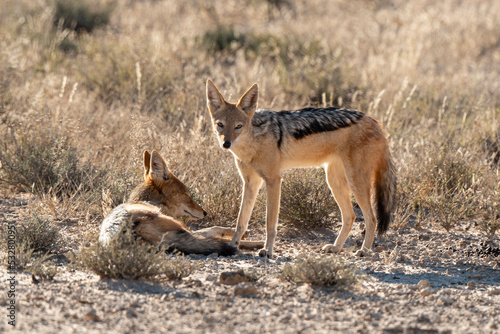 © JAG IMAGES, Obraz premium Chacal à chabraque, mange une Pintade, Canis mesomelas, Afrique