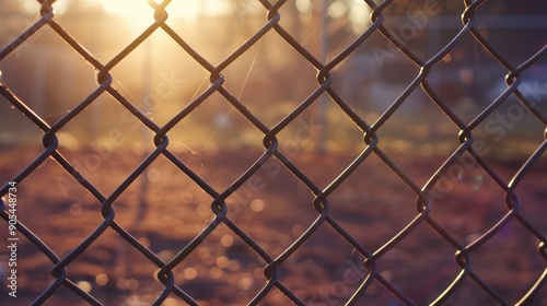 © AkuAku, Fototapeta premium Chain link fence and post in focus on a sunny morning