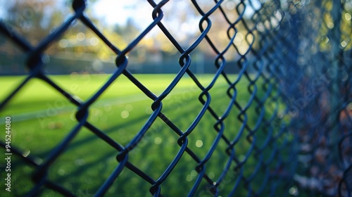 © Sandu, Fototapeta premium Chain Link Fence Close-Up with Blurred Green Field Background