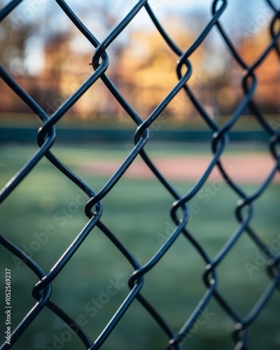 © Julia Jones, Fototapeta premium Chain link fence with blurred baseball field in the background.