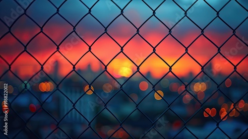 Fototapeta premium chain link fence with city lights in the background at sunset